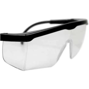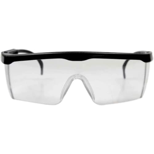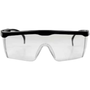 Óculos de segurança constituídos de um arco de material plástico preto com um pino central e uma fenda em cada extremidade, utilizada para o encaixe de um visor em policarbonato Incolor, laterais de proteção e hastes reguláveis, para melhor conforto e comodidade ao usuário.