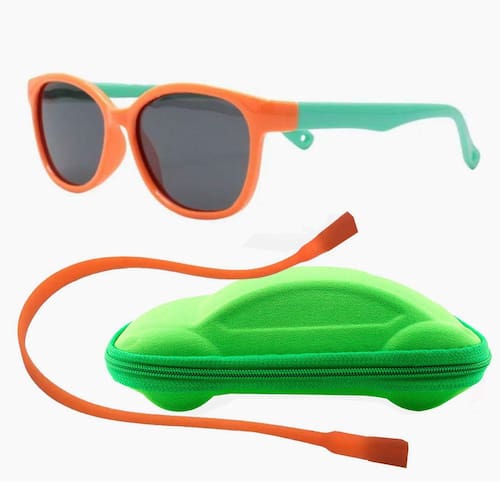 Feito com Nylon Flexível, atóxico e hipoalergênico, confortável e 100% flexível. Lentes polarizadas, proteção solar UVA e UVB. Modelo unissex. Acompanha divertido estojo em forma de carrinho para manter os óculos protegidos e cordão de silicone para manter o óculos seguro junto ao rosto.