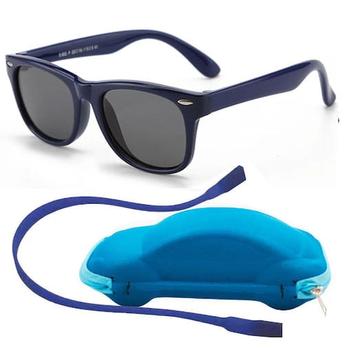 Feito em Silicone TR90, atóxico e hipoalergênico, confortável e 100% flexível. Lentes polarizadas, proteção solar total contra os raios UVA e UVB 400. Modelo unissex. Acompanha divertido estojo em forma de carrinho para manter os óculos protegidos e cordão de silicone para manter o óculos seguro junto ao rosto.