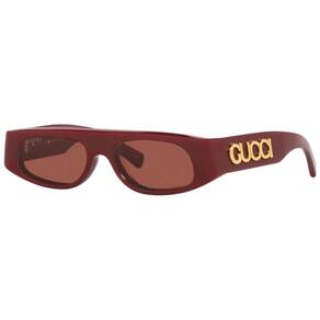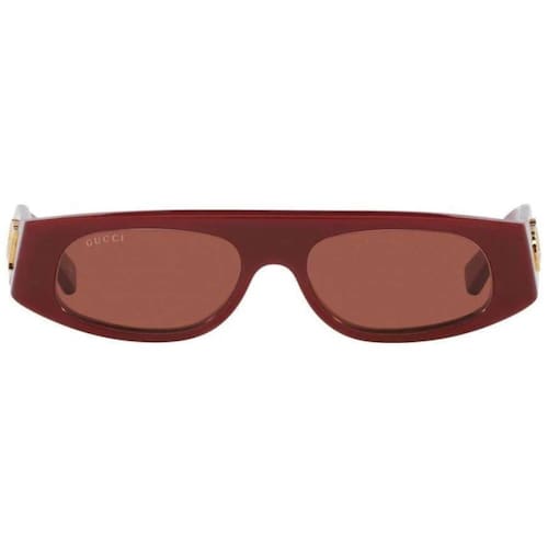 Os óculos de sol GG1771S 003 da Gucci, retangular destaca uma de acetato bold, as lentes marrom. Leva a escrita GUCCI em metal dourado que decora as hastes e eleva o design com um aceno à Maison. Proteção 100% UVA/UVB; Lente de policarbonato, resistente a arranhões; Dobradiça óptica de alta qualidade; em metal; Incluí pano de limpeza e estojo rígido. Medidas: Tamanho: 51 x 16 Haste: 140mm Cor da lente: Marrom Cor da : Bordo