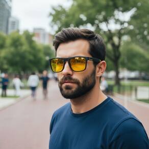 Material Resistente: Moldura de plástico com detalhes metálicos e lente em policarbonato (PC), garantindo durabilidade e leveza.