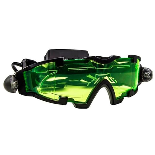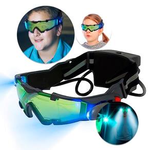 Lentes de visão noturna com luz LED e alça ajustável para crianças Esses óculos são a melhor escolha para crianças que gostam de brincar à noite ou como espiões. Basta acender as luzes para que você veja no escuro e com os olhos protegidos pelo espectador. Ele permite que as crianças andem de bicicleta, esquiem ou pratiquem esportes táticos à noite. Com luzes laterais azuis, faixas elásticas ajustáveis e almofada nasal macia. Para ativar as luzes, use o interruptor acima do compartimento da bateria. Em seguida, para acender cada luz, pressione o botão laranja em cada lado da moldura. Especificações:\ nMaterial: plástico (moldura), policarbonato (lente)\ nCor da luz LED: azul\ nAlcance de luz: 7 m\ nFonte de alimentação: 4 pilhas AAA de 1,5 V\ nTamanho do visor: 16,5 x 5,8 cm\ nPeso: 240 x BATERIAS NÃO INCLUÍDAS