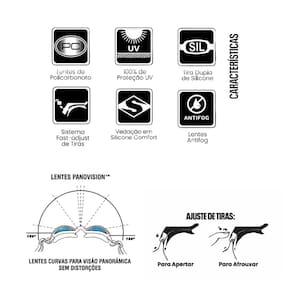 Composição: Lentes 100% Policarbonato; Tiras 100% Silicone; Vedação 100% Silicone;