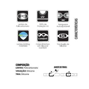 Composição: Lentes 100% Policarbonato; Tiras 100% Silicone; Vedação 100% Silicone;