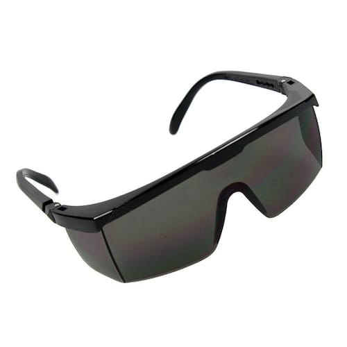 Óculos de segurança, constituídos de um arco de material plástico preto com um pino central e duas fendas nas extremidades utilizadas para o encaixe de um visor de policarbonato cinza, com um furo central, apoio nasal e protetor lateral injetado do mesmo material e uma fenda em cada extremidade para o encaixe no arco. As hastes, do tipo espátula, são confeccionadas do mesmo material do arco e constituídas de duas peças, uma semi-haste vazada com uma das extremidades presas ao arco por meio de parafuso metálico e outra semi-haste vazada que se encaixa na outra extremidade da semi-haste anterior que permite regulagem de tamanho. O arco possui meia-proteção nas bordas.