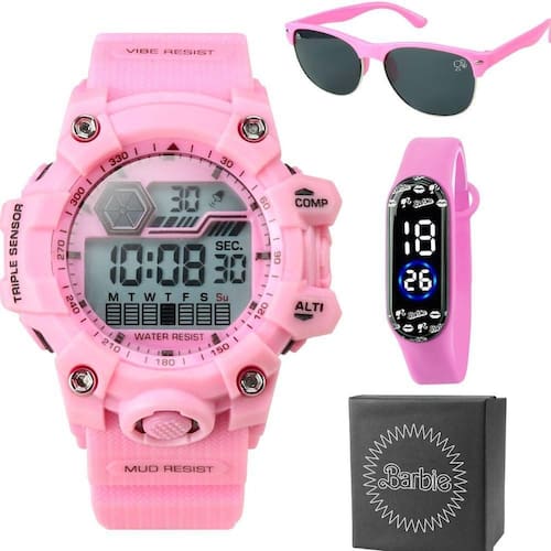 Conjunto Encantador Barbie para Meninas: Relógio, Bracelete prova d'água, Óculos e Caixa Exclusiva