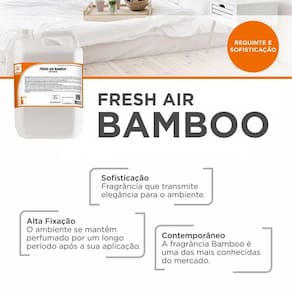 Fresh air - bamboo é especialmente desenvolvido para proporcionar um ambiente livre de odores desagradáveis como tabaco, mofo e urina. Sua formulação contém grande efeito residual de fragrância bamboo, permanecendo no ambiente por um longo período após a sua aplicação. Mantém o ambiente com um perfume suave e agradável proporcionando ao usuário uma sensação de limpeza e bem estar.