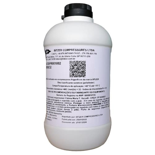 O Óleo BSE-32 Bitzer R134/404 1 Litro UCBPR001002 é uma solução de lubrificação de alta qualidade, especialmente formulada para compressores de sistemas de refrigeração que utilizam os gases refrigerantes R134a e R404A. Sua composição foi desenvolvida para garantir a eficiência na lubrificação, protegendo as peças internas contra o desgaste e a corrosão, prolongando a vida útil dos componentes e otimizando o desempenho do sistema. Ideal para manutenção e reposição, oferece alta performance e confiabilidade.