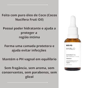 Oleo De Coco Intimo Natural Hidratante Para Regiao Intima Kalya 20ml O primeiro óleo de coco criado especificamente para sua região íntima, foi desenvolvido pela KALYA. Hyalo Coconut Oil é tudo que você pode esperar de um produto diferenciado.Sua hidratação favorece, protege e forma uma barreira protetora em casos de secura íntima, ajudando na lubrificação natural.Feito com puro óleo de Coco Cocos Nucifera Fruti Oil , também possui Vitamina E em sua composição conhecido como um poderoso hidratante e regenerador da peleAlém disso, Hyalo Coconut Oil é vegano, sem fragrância, sem glicóis, sem parabenos e sem corante. Observações importantes: -O óleo de coco puro tende a ficar duro devido a presença de ácidos que o constituem, sofrendo o processo de solidificação quando exposto a uma temperatura inferior a 25 graus. Para que tornem líquido novamente, pode ser colocado ligeiramente em banho maria ou colocar a quantidade desejada na palma das mãos esfregando até esquentar e derreter o óleo. -hyalo Coconut Oil é um produto hidratante de uso externo que favorece a lubrificação natural íntima e NÃO pode ser utilizado como lubrificante no momento da relação e também NÃO pode ser utilizado com preservativo pois pode haver rompimento do mesmo. PRINCIPAIS BENEFÍCIOS: Protege a região íntimaForma uma camada que ajuda evitar infecções Auxilia no tratamento de fungos que já estão no localAlto poder hidratante para a região íntimaMantém o PH da região íntima em equilíbrio ANVISAProcesso: 25351.223400/2022-56 AFE 2.02.756-2 Composição: Cocos Nucifera Fruit Oil, Tocopheryl Acetate. Óleo de Coco, vitamina E Modo de Usar: Aplicar na pele massageando suavemente. Principais Tags de Pesquisa:Óleo de coco benefícios na região íntima, oleo de coco para saude intima, oleo de coco saude intima, oleo de coco intimo, óleo de côco extra vírgem para regiao intima Marca: Kalya
