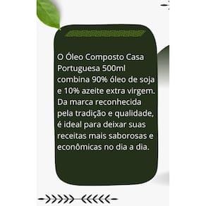 Descubra o Óleo Composto Casa Portuguesa, uma combinação perfeita de 90% de óleo de soja e 10% de azeite de oliva extravirgem, ideal para suas receitas diárias. Com um volume de 500ml, este óleo é livre de glúten, tornando-se uma opção saudável para todos.