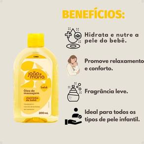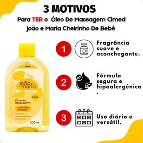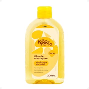 Modo De Uso Aplique pequenas quantidades do Óleo de Massagem Cimed João e Maria nas mãos e espalhe suavemente pelo corpo do bebê, realizando movimentos circulares delicados até a completa absorção. Evite aplicar no rosto e nas áreas próximas aos olhos.