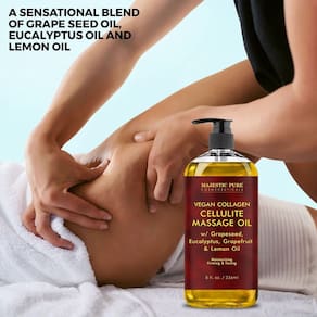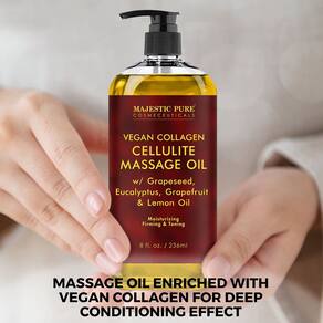- Óleo de massagem Majestic Pure Cellulite, totalmente natural, sem substâncias químicas nocivas, com fórmula exclusiva de ÒD-Limoneneó; fabricado nos EUA