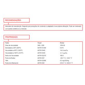 Loja Oficial Giro Moto Parts MOTUL 5100 é um lubrificante para motor de motos 4T que atende as demandas de confiabilidade para uso diário ou atividades recreativas.Adequado para qualquer tipo de motocicleta off-road ou de rua equipada com motor 4 tempos, com ou sem caixa de câmbio integrada, embreagem seca ou úmida.Perfeito para motocicletas com sistemas de pós-tratamento dos gases de escape, como conversores catalíticos ou injeção de ar secundária. Outras aplicações: Quadriciclos, UTVs e motos aquáticas, dependendo da recomendação de viscosidade do fabricante.Especificações:• Marca: Motul• Aplicação: Motor• Tipo de Motor: 4T• Tipo de Produto: 5100• Viscosidade: 10W-50• Normas API: API SP, JASO MA2 (2023)• 1 LitroConteúdo da Embalagem:01- Óleo Motul 5100 10W50