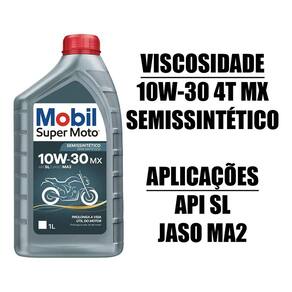 "Mobil Super Moto 4T MX 10W-30 é um óleo semissintético multiviscoso de alto desempenho, desenvolvido e testado para proporcionar efetiva proteção contra o desgaste. Altamente estável aos esforços mecânicos, mantém a viscosidade mesmo em condições severas. Resistente à oxidação, evita a formação de depósitos e proporciona vida mais longa para o motor devido à formação de uma resistente película de lubrificação. Sua composição semissintética e aditivos selecionados fornecem excelente fluidez para reduzir o desgaste do motor na partida, além de proteger a transmissão e a embreagem durante toda operação da motocicleta. Atende aos requisitos da especificação JASO MA2 e possui nível de qualidade API SL. A formulação de Mobil Super Moto 4T MX 10W-30 é cuidadosamente balanceada para proteger os dispositivos de pós-tratamento que podem ser encontrados nos sistemas de escape das motocicletas modernas. Características e Benefícios O Mobil Super Moto 4T MX 10W-30 apresenta as seguintes características e benefícios de desempenho para os usuários: n Fornece proteção antidesgaste para uma vida longa do motor e da transmissão n Ajuda a manter a limpeza do motor graças à sua formulação especialmente balanceada n Óleo com base super premium que proporciona alta estabilidade de oxidação e volatilidade reduzida n Tecnologia com teor de fósforo reduzido para proporcionar proteção do catalisador n Propriedades de fricção para um desempenho adequado de embreagem n Formulação de alta resistência ao cisalhamento para manutenção do grau de viscosidade Aplicações Mobil Super Moto 4T MX 10W-30 é um óleo semissintético com tecnologia avançada recomendado para motocicletas modernas de quatro tempos, para as quais as especificações do fabricante recomendam o uso de um óleo de motor SAE 10W-30. Formulado para oferecer o nível de proteção adequado para o motor, transmissão e embreagem, especialmente para os motores arrefecidos a ar, que tendem a operar em regimes térmicos mais elevados. Também é especialmente recomendado para motos 4 tempos equipadas com catalisadores para reduzir as emissões. É recomendado para as aplicações que requerem óleos API SL e atende aos requisitos de desempenho JASO MA2 (Certificação: M055CLE010)."