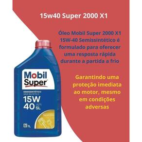 Além disso, o Óleo Mobil Super 2000 X1 15W-40 Semissintético é formulado para oferecer uma resposta rápida durante a partida a frio, garantindo uma proteção imediata ao motor, mesmo em condições adversas. Sua embalagem de 1 litro é conveniente e prática, facilitando o manuseio e o armazenamento.