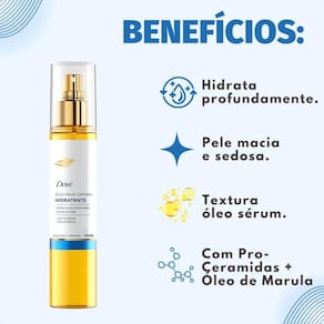 O Óleo Sérum Corporal Dove Hidratante Pró Ceramidas 150ml é a solução ideal para quem busca uma pele profundamente hidratada, macia e com um brilho saudável, sem a sensação oleosa. Desenvolvido pela DOVE, este sérum inovador atua no tratamento da pele, prevenindo a perda de hidratação por até 48 horas. Sua fórmula exclusiva, com Pro-Ceramidas e Óleo de Marula, garante uma absorção rápida e eficaz, transformando a rotina de cuidados corporais em uma experiência de bem-estar para todos os tipos de pele. Ideal para quem busca praticidade e resultados visíveis, este óleo sérum proporciona uma experiência de cuidado única, deixando a pele radiante e nutrida. Descubra o segredo para uma pele impecável com Dove.