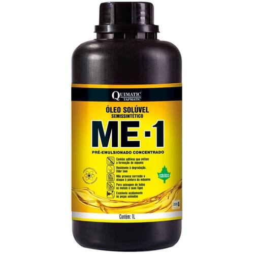 - O ME-1 da Quimatic é um óleo solúvel semissintético para usinagem de todos os metais em diversas operações, inclusive em CNCs. Similar às características de lubricidade de um óleo solúvel mineral convencional, mas com vida útil de um óleo solúvel semissintético, o ME-1 reune as melhores propriedades de cada tipo. O produto possui fórmula concentrada de agentes emulsionantes, lubricidade, aditivos anticorrosivos, bactericidas e antiespumantes, garantindo o melhor balanceamento em refrigeração e lubrificação nas operações de corte de metais. Produto ecológico, isento de nitrito, boro, cloro, enxofre e metais pesados. Seguindo a correta utilização, não irrita a pele do operador e não produz névoa no ambiente de trabalho.