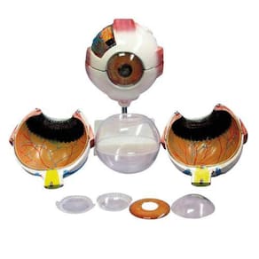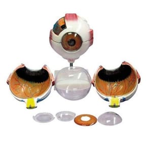 Modelo anatômico do olho, ampliado aproximadamente 6 vezes o tamanho natural, apresenta estruturas que os compõem. Desmontável em até 8 partes, confeccionado em resina plástica.