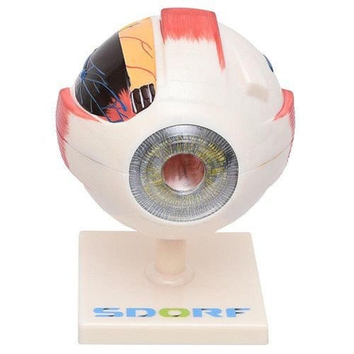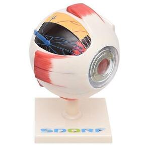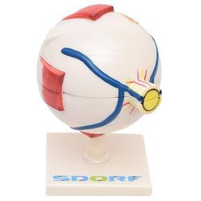 O modelo anatômico de olho ampliado em aproximadamente 10 vezes e dividido em 7 partes, e confeccionado em PVC e acrílico; O modelo SD-5043 apresenta as seguintes estruturas entre outras:* Corpo Ciliar;* Zônula Ciliar;* Íris;* Pupila; * Pólo Anterior;* Pólo Posterior;* Câmara Anterior;* Câmara Posterior;* Córnea;* Borda Serreada;* Lente;* Retina;* Coroide;* Esclera;* Nervo Ótico;* Corpo Vítreo;* Músculo Elevador Da Pálpebra Superior;* Músculo Reto Medial;* Músculo Reto Lateral;* Músculo Reto Inferior;