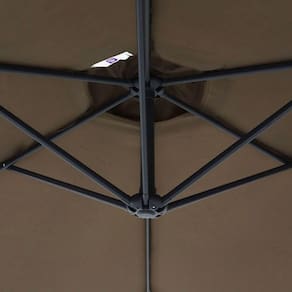 Ombrelone Suspenso Veneza Suspenso 3,00m Marrom Bel 100% Poliéster Haste e varetas em aço Haste 48 mm Varetas de 12mm x 18 mm, comprimento: 52 cm Altura (até o topo): 2,45 m Altura (até o tecido): 1,95 m FPS: 35 Base em X para fixação de contrapeso (contrapeso nao incluso) Contrapeso recomendado: 60 kg
