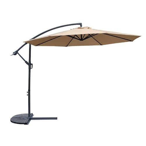 Estrutura em alumínio e pintura a pó, base cruz em aço, compatível com base lateral. Cobertura quadrada de 2,5 x 2,5m em tecido poliéster de 160G/M, impermeável e com proteção UV.