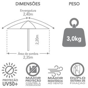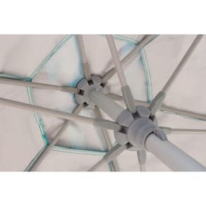 Varetas fabricadas em fibra de vidro garantem maior resistência aos efeitos da corrosão e as ferragens não ficam aparentes as inteméries da natureza. Conta ainda com cobertura do tipo ombrelone e duplo sistema de fixação com alavanca plástica e pino duplo, que garantem maior segurança na junção das duas partes do guarda sol, evitando assim, que a parte superior se solte com o vento