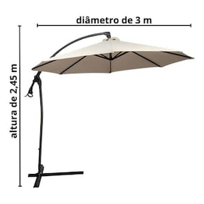 • Cobertura em poliéster • Cobertura de 3,00m de diâmetro / Altura 2,45m • Haste de diâmetro 48mm em alumínio com manivela • Varetas em ferro • Acompanha base de encaixe em formato de cruz