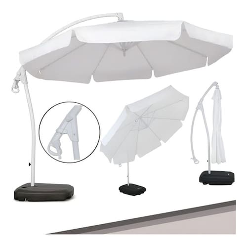 Sua cobertura em poliéster com extra ventilação vai te proteger dos raios solares, além de manter a sombra sempre fresca. O Ombrelone Suspenso Búzios Giratório 360° 3,00m Branco tem haste em alumínio, acionamento por manivela e inclinação regulável para projetar melhor a sombra de acordo com a posição do sol. O ombrelone é um produto de fácil manuseio, com giro de 360o e suporte para luminária.