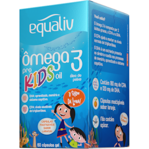 Equaliv Ômega 3 Pro Kids Oil é um suplemento à base de óleo de peixe, em cápsulas mastigáveis sabor laranja, recomendado para o público infantil.
