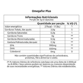OMEGAFOR PLUS - 240 cápsulasO Ômegafor Plus é um suplemento alimentar à base de óleo de peixe rico em ômega-3. Possui alta concentração de seus derivados, ácido eicosapentaenoico (EPA) - 990mg e ácido docosahexaeoico (DHA) - 660mg (porção de 3 cápsulas).Possui certificação pelo Programa Internacional de Padrões de Óleo de Peixe (IFOS (tm)), o único programa de testes e certificação de terceiros para óleos de peixe. Definindo os padrões mais altos do mundo em pureza, potência e frescor. Benefícios:- Auxilia na prevenção de doenças cardiovasculares- Potente ação anti-inflamatória- Fortalecimento do sistema imunológico- Benefícios nos padrões cognitivos como concentração e memóriaEmbalagem: 240 cápsulas de 1g
