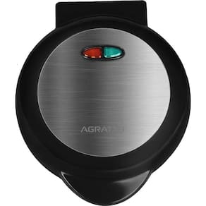 Omeleteira elétrica redonda com acabamento em inox, 800W de potência, chapas antiaderentes, luzes indicadoras de funcionamento e aquecimento, base porta fios, alça isotérmica e capacidade para 2 omeletes por vez com linha divisória. Prepara diversos alimentos como omeletes, waffle, pão de queijo, tapioca, entre outros. Injetada em baquelite com alças e superfícies externas frias.Base antiderrapante