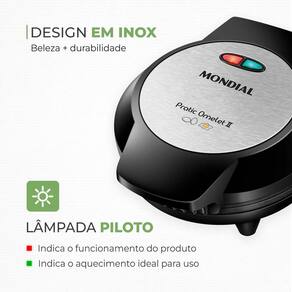 Omeleteira Pratic Omelet Li Om-04-Bi 800W Preto 220V Preta 220V Omeleteira pratic omelet li om-04-bi 800w preto 220v Se você busca aliar uma alimentação saudável com praticidade na cozinha, a omeleteira mondial é o item perfeito para a sua rotina você consegue cozinhar duas porções ao mesmo tempo e pode preparar, além de omelete, panquecas, crepiocas calzones, entre outros. Além disso, por te revestimento antiaderente, não é necessário incluir óleo na receita. Saiba mais sobre a pratic omelet ii om-04-bi: Rotina prática na cozinha: você busca uma rotina mais prática na cozinha Com a omeleteira mondial, você prepara dois omeletes ao mesmo tempo E diversas outras receitas De forma rápida e prática. Antiaderente: alimentação saudável: a omeleteira tem revestimento antiaderente: os alimentos não grudam e não é necessário utilizar óleo nas receitas. Muito mais saudável, né Além disso, é fácil de limpar. Omelete e muito mais você pode preparar diversas receitas, como tortas, panquecas, calzones, crepioca, tortilha e muito mais. Libere a criatividade e mãos à obra Potência: são 800w e as chapas aquecem por igual rapidamente. Acabamento em aço inox: mais durabilidade e sofisticação na cozinha. Controle de temperatura automática: você não precisa regular a temperatura. É só colocar os ingredientes e verificar quando o prato chegou no ponto do seu gosto. Alça fria: de segurança e proteção durante o preparo. Um ano de mondial: a mondial é a escolha de milhões de consumidores. Mondial, a escolha inteligente Modelo: om-04-bi Cor: preto/inox Voltagem tensão : 220v Itens inclusos: 1 omeleteira, 1 espátula, 1 manual de instruções, 1 livro de receitas Capacidade: 2 porções Comprimento do cabo: 1,5m Antiaderente: sim Alimentação: senergia elétrica Tipo de tomada: s10a Material: pp Prepara quais alimentos: você pode preparar diversas receitas, como tortas, panquecas, calzones, crepioca, tortilha e muito mais Luz indicadora: sim Dimensões: 10cm x 20cm x 22cm axlxp Potência: 800w Peso: 860g : 12 meses