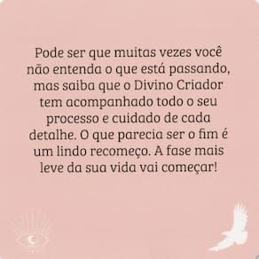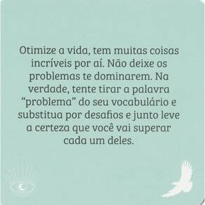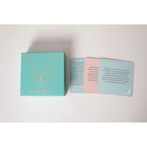 Oráculo Além do Eu O oráculo Além do Eu contém 50 frases intuitivas. Ele foi desenvolvido para te auxiliar na expansão da sua consciência, conectar com a sua essência e transcender o seu poder pessoal. Um instrumento de alma que te levará para um olhar além do Eu. Modo de usar: Respire fundo e peça para o universo te enviar a mensagem que você precisar ler nesse momento.