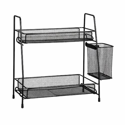 Máximo Aproveitamento Vertical: Dois níveis de armazenamento que dobram a capacidade da sua bancada ou pia sem ocupar espaço extra na superfície. Design Aramado Inteligente: A estrutura em tela permite a circulação de ar e evita o acúmulo de água, sendo ideal para manter itens de higiene sempre secos. Suporte Lateral Incluso: Acompanha cesto acoplado perfeito para escovas de dente, pincéis de maquiagem ou utensílios estreitos, centralizando tudo em um só lugar. Acabamento de Alta Qualidade: Pintura eletrostática que garante resistência contra riscos e descascamentos, mantendo o aspecto de novo por muito mais tempo. Estabilidade Garantida: Pés com elevação que facilitam a limpeza por baixo do organizador e garantem firmeza em superfícies lisas de banheiros e cozinhas.