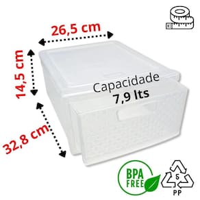 Organizador Calcado Nitron Quadrado Natural Hey, seja bem- vindo a Loja Numero1 ELETRO Estamos felizes em tê-los aqui conosco.O Gaveteiro organizador de calçados modular empilhável com decoração Rattan Nitron é essencial para guardar e organizar sapatos, tênis, sandálias, chinelos ou qualquer objeto que quiser em casa, no apartamento, no escritório ou no consultório. Além de ser incrivelmente resistente ele também possui um design moderno e tem encaixes perfeitos na tampa para que outros gaveteiros do mesmo modelo possam ser empilhados um em cima do outro . Economize espaço e organize qualquer tipo de objeto no Gaveteiro modular empilhável com decoração Rattan Nitron.Características do produto:Marca: Nitron. Cor: Transparente. Material: Polipropileno. Dimensões: 32,8 cm x 14,5 cm x 26,5cm. Capacidade: 7,9 litros. Validade: Prazo indeterminado A Número1 é uma empresa familiar que preza pelos clientes acima de tudo. Agradecemos a preferência e aguardamos a sua compra. Seja bem-vindo a Família Número1.