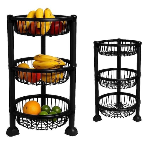Organizador Chao 3 Prateleiras Fruteira Andares Estante Multiuso Cesto Desmontavel Redonda Cozinha Banheiro Preta