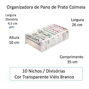 Para que serve Este organizador serve para armazenar e organizar diversos itens como, por exemplo: - Para panos de prato; - Para organizar camisetas, jaqueta infantil, bermuda de malha, moletom infantil, pijama infantil, biquinis sem bojo, leggings, toalha de mesa e rosto dentre outros; - Perfeito para armazenar Camisetas Femininas e Masculinas Esse prático kit possui 2 organizadores colmeias com 10 dez nichos cada, divisórias, para facilitar a organização de gavetas e do armário, na sua cozinha / copa e no se quarto. Confeccionada em plástico transparente, ela facilita a visualização das peças para que suas peças fiquem sempre protegidas. Otimize seu espaço e guarde as peças em um mesmo lugar, que podem ser levadas inclusive em viagens e encontros com amigos e grupos. Marca: Não Informado
