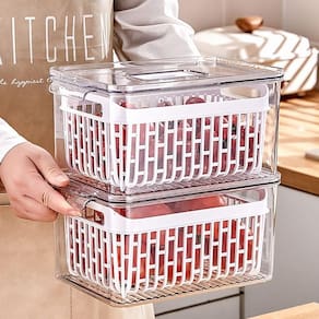 O Organizador com Cesto Dry 6 L é uma caixa organizadora transparente com tampa e cesto que serve para guardar mantimentos frescos na geladeira. É ideal para colocar frutas, legumes e verduras, garantindo que a comida permaneça fresca por mais tempo.É elegante, funcional, empilhável e higiênico. Com este item você une utilidade e modernidade à organização da cozinha.Fabricado na cor transparente, com aspecto de vidro, este Organizador com Cesto é produzido com alças laterais que, além de discretas, são extremamente funcionais para o transporte seguro e confortável. Suas dimensões têm 32,5 cm de comprimento, 16,5 cm de largura e 15 cm de altura.Com grande aplicabilidade, esse item é essencial para organização. O Organizador com Cesto 6 L da Linha Dry/Coza traz design requintado e compromisso ecológico. Sua composição em polietileno tereftalato é 100% reciclável, tornando-o leve e fácil de limpar.Disponível em diferentes tamanhos, estas caixas se adequam a diferentes necessidades. Multifuncional, os organizadores empilháveis de geladeira da linha Dry foram especialmente desenhados para maximizar o espaço em seu refrigerador.O cesto interno é na cor branco, possui um escorredor e sua função é deixar os alimentos sempre frescos. A tampa tem respirador integrado e permite a circulação de ar. O Organizador com Cesto Dry 6 L Linha Dry integra a coleção de itens de organização da Coza. Fabricados com os mais rigorosos padrões técnicos e de segurança para você e sua família, os produtos da Coza são pensados para todas as necessidades, oferecendo o que há de mais tecnológico, moderno e elegante em cestas e caixas organizadoras.