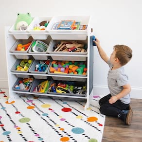 Humble Crew Organizador de armazenamento de brinquedos com 12 compartimentos com quadro-negro, borracha e 2 peças de giz, branco/cinza dégradé ombré - Caixas de armazenamento removíveis para brincar e limpar facilmente. - Estrutura de construção de madeira robusta reforçada com cavilhas de aço, capacidade de peso de 9 kg por nível. - 12 caixas de armazenamento de plástico durável, 8 caixas de armazenamento intercambiáveis padrão e 4 grandes (equivalente a 8 caixas padrão). Livre de BPA e ftalatos. - Acabamento branco neutro com detalhes de quadro-negro no painel lateral, inclui 2 peças de giz sem poeira e uma borracha. - Suportes estabilizadores e âncoras de parede fornecem suporte adicional de segurança. - Tamanho do produto — 106 cm L x 28 cm P (40,6 cm P com suportes estabilizadores) x 78,7 cm A, Tamanho do compartimento padrão: 30,5 cm C x 23 cm L x 15,2 cm A, tamanho do compartimento grande: 40,6 cm C x 30,5 cm L x 15,2 cm A