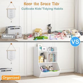 - Espaço de armazenamento de grande capacidade: a parte superior deste organizador de brinquedos e armazenamento serve como uma estante para exibir livros ou itens de decoração de casa. Os 2 compartimentos de armazenamento no meio e o compartimento grande na parte inferior podem armazenar uma grande capacidade de brinquedos e outros objetos, economizando muito espaço.