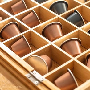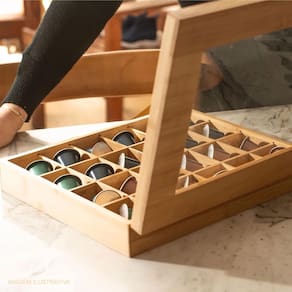 O Organizador de Cápsulas 24 Divisórias transforma a experiência de servir, para uma rotina com mais conforto e conexão com o lar. Possui 24 divisórias e tampa com visor transparente para facilitar a visualização e organização das cápsulas. O bambu promove a sustentabilidade de um material 100% renovável, e traz sofisticação para decorar a sua casa. A Linha Sense ressignifica o ato de servir e valoriza os pequenos momentos, trazendo elegância e bem-estar para a sua casa do café da manhã ao jantar.