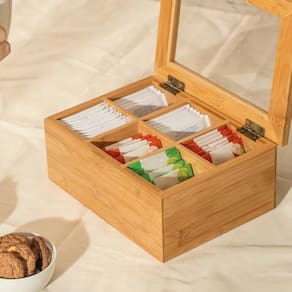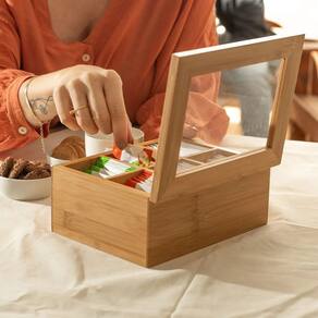 O Organizador de Chá com 6 Divisórias transforma a experiência de servir, para uma rotina com mais conforto e conexão com o lar. Possui [x] divisórias e tampa com visor transparente para facilitar a visualização e organização dos sachês. O bambu promove a sustentabilidade de um material 100% renovável, e traz sofisticação para decorar a sua casa. A Linha Sense ressignifica o ato de servir e valoriza os pequenos momentos, trazendo elegância e bem-estar para a sua casa do café da manhã ao jantar.