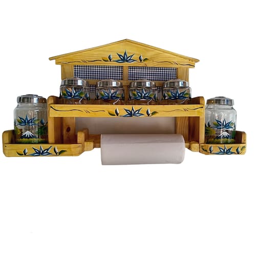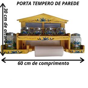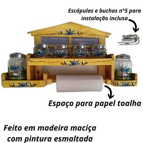 Suporte Para Papel Toalha E Condimentos Com 6 Vidros Lindos porta tempero artesanal com 06 vidros para tempero e espaço para papel toalha Produzido de modo totalmente artesanal decorado a mão Produzido em madeira maciça ( DE LEI ) ecologicamente correta com pintura esmaltada para proporcionar fácil limpeza, os potes para tempero são de vidro, tampa de alumínio com trava. Cabe 1 papel toalha São 4 potes com a capacidade de 220 ml e 2 vidros com a capacidade de 500 ml de capacidade Medidas do suporte: 12 cm de largura 60 cm de comprimento 30 cm de altura