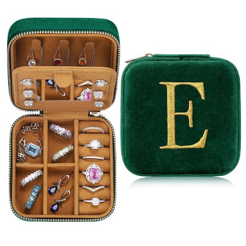 -?MATERIAIS DE ALTA QUALIDADE?: O estojo de joias é feito de veludo esmeralda luxuoso de alta qualidade que pode evitar que suas joias arranhem, é resistente e durável. Vem com um compartimento secreto para brincos e um espelho compacto embutido. O fecho com zíper mantém todas as suas joias seguras por dentro e fáceis de abrir e fechar.