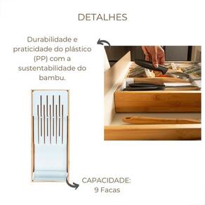 O Organizador De Facas 9 Divisórias Gavetas Cozinha Keep Bambu é feito com bambu, um material 100% renovável, que traz sofisticação para a decoração da sua casa. Seu design modular permite uma harmonia completa com o ambiente, enquanto suas 9 divisórias garantem que suas facas sejam acomodadas de forma segura, preservando o fio e evitando acidentes. Produzido com plástico PP de alta resistência, o organizador oferece durabilidade e praticidade. Além de trazer organização para a sua cozinha, o organizador de facas da Keep possui um design moderno, economiza espaço e oferece praticidade no dia a dia. A marca Keep é conhecida pela qualidade e durabilidade dos seus produtos. Compre agora o Organizador De Facas 9 Divisórias Gavetas Cozinha Keep Bambu e eleve o nível da organização da sua cozinha. Ean: 7908466037697