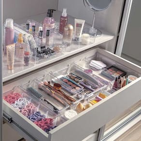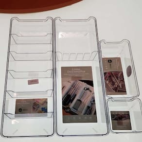 Organizadores de gaveta transparente e retangular. Caixas organizadoras são produzidas em material atóxico, 100% reciclável e livre de Bisfenol A (BPA Free). O organizador de gaveta tem alta transparência, design bonito e prático.