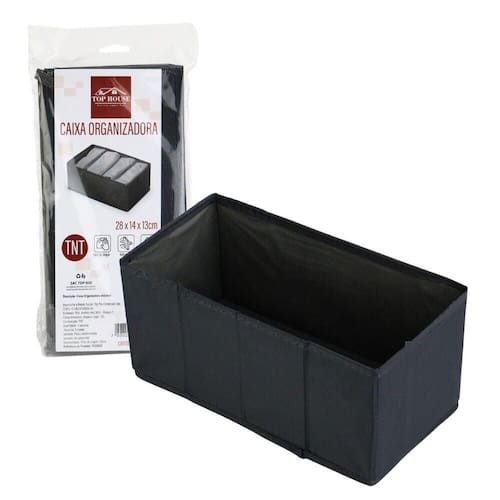Organizador de Gaveta TNT 13x28cm Cinza - Para manter uma casa organizada utilize uma caixa organizadora! Ela é perfeita para você guardar suas coisas e economizar espaço. É uma maneira muito prática e funcional para manter a organização do ambiente;\n- Pode ser utilizada e diversos lugares da sua casa: no guarda-roupa, banheiro, sala etc. Seu formato compacto permite ser dobrada quando não for utilizada;\nEspecificações:\nMarca : TOP RIO\nTipo de material : TNT\nCores ou Estampa : Cinza\nDimensões do Produto : 13 X 28 X 14 CM\nDimensões da Embalagem : 33 X 15 X 1,5 CM\nPeso Bruto (Gramas) : 0.184