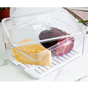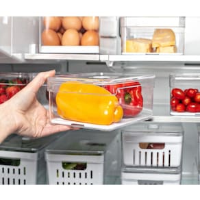 Organizador De Geladeira 2,2L Organizador Clear Fresh Com Bandeja De Drenagem E Respiradouro OU. #Com respiradouro e bandeja de drenagem #Organizador de geladeira transparente #Linha Clear Fresh OU Garantia: 90 Dias / Peso: 286g / Cores: Natural e branco / Ref: OF400NT Dimensões: 20cm (C) x 15cm (L) x 9,5cm (A) Dimensões internas: 18,5cm (C) x 14cm (L) x 8cm (A) Capacidade: 2,2 Litros. Limpeza e cuidados: - Lavar com água e sabão neutro utilizando esponja macia, seguido de pano seco; - Não utilizar produtos químicos ou abrasivos na limpeza; - Não suporta máquina de lavar; - Evitar batidas. Detalhes do produto: - A tampa com respiradouro ajustável mantém o nível de umidade ideal para cada tipo de alimento, mantendo-os frescos por mais tempo; - Possui bandeja de drenagem que evita que os alimentos fiquem molhados após a lavagem, ajudando a prevenir a deterioração precoce; - Possui total transparência para você enxergar o conteúdo e manter tudo em ordem; - Não suporta micro-ondas; - Livre de bisphenol A; - Não suporta freezer; - Suporta geladeira; - Empilhável. Materiais: - Polipropileno (PP); - Poliestireno (PS). O organizador Clear Fresh da OU é o novo padrão de transparência na organização da sua geladeira. Seu design foi pensado para promover frescor prolongado aos alimentos, mantendo uma rotina sem desperdícios. Com capacidade de 2,2 litros e formato quadrado que permite o empilhamento, o organizador para geladeira possibilita o armazenamento de vários tipos de alimentos, mantendo-os frescos e saudáveis por muito mais tempo.