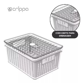 Organizador de geladeira pequenho frutas legumes com cesto ========== sobre o produto ========== O organizador de geladeira pequeno frutas legumes com cesto é a solução ideal para manter seus alimentos frescos e organizados por mais tempo. Com um design inteligente, ele conta com um cesto removível que permite melhor circulação de ar, evitando o acúmulo de umidade e prolongando a vida útil de frutas, legumes e verduras. Feito em plástico transparente de alta qualidade, ele facilita a visualização do conteúdo, ajudando a otimizar o espaço da geladeira e mantendo tudo ao seu alcance de forma prática e higiênica. Este organizador é essencial para quem busca eficiência na cozinha e quer garantir mais frescor aos alimentos. ========== especificações ========== Cesto removível, que facilita a ventilação e evita o acúmulo de umidade. Ideal para armazenar frutas, legumes e verduras com segurança. Material plástico transparente de alta durabilidade, fácil de limpar. Design compacto e prático, otimiza o espaço interno da geladeira. ========== ficha técnica ========== Medidas: 20,5 x 15,5 x 10cm Material: poliestireno ps + polipropileno pp Marca: crippa : 3 meses Estamos online para quaisquer dúvidas, Agradecemos e aguardamos o seu pedido. P: o cesto é removível para facilitar a limpeza R: sim, o cesto é removível, facilitando a limpeza e ventilação dos alimentos. P: posso armazenar outros tipos de alimentos além de frutas e legumes R: sim, o organizador é versátil e pode ser para diversos alimentos, como queijos, frios e embutidos. P: é seguro para contato com alimentos R: sim, o material plástico é seguro para armazenar alimentos e fácil de higienizar. P: o produto é novo ou