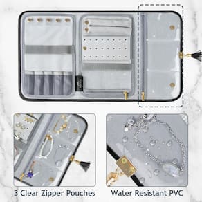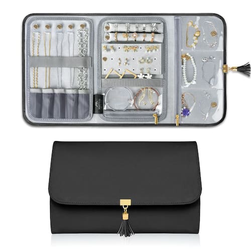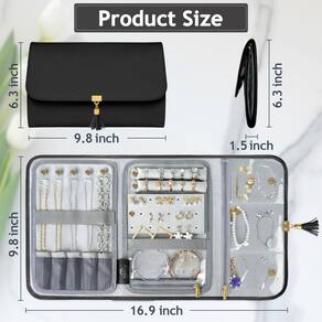 Você ainda está preocupado em como manter suas joias? Use um organizador de joias para resolver facilmente seus problemas. Este estojo de transporte de joias manterá suas joias organizadas e seguras de cair. Coloque esta bolsa de joias decorativa na cômoda do seu quarto e eleve seu quarto em segundos! 5 compartimentos diferentes são projetados de acordo com suas necessidades diárias. A caixa de joias elegante comporta seus colares, anéis, brincos, tiaras, pulseiras, broches, relógios e muito mais, garantindo que você sempre encontre seus itens rapidamente Tamanho espaçoso. Alça com fivela para colar – 5 tiras com 5 bolsas elásticas abaixo para guardar colares. A fita mágica prende colares ou correntes em um lugar e desembaraça Anel longo com fivela – 2 pulseiras podem conter dezenas de anéis Painel de brincos – 1 painel total com 23 furos para organizar brincos Bolso transparente com zíper – 1 bolso espaçoso para guardar pulseiras ou outros objetos de valor. pequenas bolsas visíveis – lugar extra para guardar seus pequenos itens Informações do produto: Material externo: couro PU, resistente à água e resistente Material interno: poliéster, macio ao toque e protege suas joias de danos ou abrasão Cor: Preto Dimensão dobrada: 24 cm C x 15 cm L x 3 cm A, abra este armazenamento de joias com fecho magnético para acesso rápido aos seus acessórios Dimensão desdobrada: 40 cm C x 24 cm L Excelente opção de presente. Um presente perfeito para mulheres no aniversário, dia das mães, Natal, casamento, aniversário e muito mais Bolsas de presente de Natal, presentes para mulheres, presentes para irmã, caixas de presente de joias, presentes para ela, presentes de Natal para mulheres, ideias de presentes para familiares, presentes para melhores amigas, organizador de bolsas de presentes, presentes para mulheres de trabalho, presentes para mulheres, presentes para mulheres, presentes para mulheres, presentes para mulheres, presentes para mulheres, bolsas de joias, presentes para namorada, ideias de presentes de viagem, bolsa de presente de joias - Capacidade espaçosa: Tamanho dobrado: 24 cm C x 15 cm L. Tamanho desdobrado: 40 cm C x 24 cm L. Peso: 300 g. Este organizador de joias pode ser facilmente colocado em uma bolsa, mochila, bagagem ou mala. 5 tipos de compartimentos – 2 anéis com fivela + 1 painel de brincos + 5 tiras finas + 3 bolsos pequenos transparentes visíveis + 1 bolsa com zíper. Os bolsos pequenos ficarão um pouco apertados. Basta colocar suas joias diferentes em seus compartimentos separados - Design protetor: o material externo é feito de couro PU resistente à água que pode ser limpo com tecido facilmente. O material de poliéster macio pode proteger bem as joias, macio ao toque e resistente a arranhões. O fecho magnético da bolsa de joias permite que você abra facilmente e economize tempo. O design exclusivo de borla pequena torna a bolsa fofa - Nunca perca suas joias: o fecho de gancho e laço do compartimento do colar é projetado para proteger seus colares para evitar emaranhados, e a alça elástica pode fixar bem os brincos longos. Bolsos transparentes de diferentes tamanhos permitem que você sempre encontre as joias que deseja. Perfeito para armazenar e organizar suas joias favoritas onde quer que você vá - Companheiro perfeito para a vida: este organizador de joias de viagem não é apenas uma necessidade conveniente de viagem para você usar no armazenamento de joias em casa, mas também deve ter adequado para viagens de negócios, viagens internacionais, sair para festas, cruzeiros de férias e outras atividades ao ar livre. Também pode ser usada como uma bolsa feminina moderna para decoração - Bons presentes de Natal: esta bolsa de joias pode ser usada para armazenar colares, brincos, anéis, relógios dobráveis, pulseiras, laços de cabelo. (Observação: não é adequado para bijuterias grandes) Uma ideia perfeita de presente de viagem para esposa, namorada, mãe ou melhores amigas no Natal, Ano Novo, aniversário, casamento, aniversário